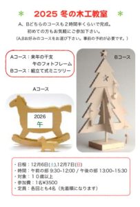 2025-11-26 Home › お知らせ › 2025年 冬の木工教室のお知らせ 2025年 冬の木工教室のお知らせ 事前の予約が必要です 関連記事 臨時休業のお知らせ 臨時休業のお知らせ 「沙羅 & AU・AU」展 冬の木工教室のお知らせ 6月21日(土)・22日(日)は臨時休業致します 夏の木工教室